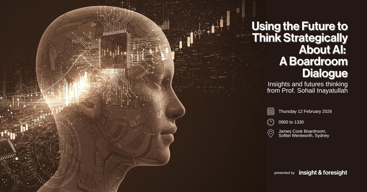 To be held on Thursday 12 February 2026 in the James Cook Boardroom at the Sofitel Wentworth in Sydney, this event will feature Professor Sohail Inayatullah, a renowned futurist and foresight expert, as the keynote speaker. Professor Inayatullah will share in-depth insights on the topic of AI and how it could shape our futures. Our goal is to equip C-level thinkers and decision makers with the knowledge and tools necessary to stay ahead of the curve and successfully navigate the rapidly changing world of AI.